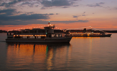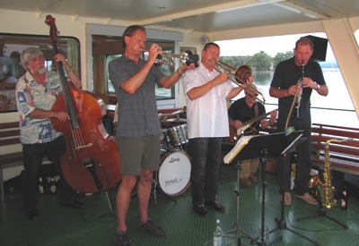 Rhythmen, Bebop, klassischer Jazz, Swing und vor allem halt Dixieland. Die weiteren Musiker waren Michael Weigl an Klarinette und Saxophon, sein Bruder Christoph Weigl an der Trompete, dem Salzburger Schlagzeuger Michael Honzak, Helmut Hartwig an der Swing Gitarre und dem neuesten Mitglied Hans Kohlbrenner am Kontrabass. Da an dieser Abend beste Wetterverhältnisse waren, spielte die Band die kompletten 4 Stunden auf dem Freideck. |