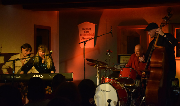 Zwei der ohnehin seltenen Boogie-Pianistinnen brachten das Kunststück fertig: Cili Marsall aus Ungarn, aber in Wien lebend, und Katharina Alber aus Innsbruck, als Boogie-Kathi seit Jahren eine Szene-Größe. Die beiden Männer von der Rhythmus-Fraktion waren Peter Müller am Schlagzeug und Karol Hodas am Bass. Beide ebenfalls aus Österreich, überließen mit viel hörbarem Spaß den beiden Ladys die Star-Rolle des Abends. |