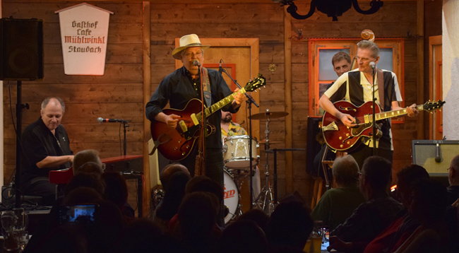 Doch sie scheinen es zu mögen. Dee Dee: Bandleader mit Gitarre und geiler Stimme, Matthias Heiligensetzer: Piano, Gene Black: Bass, Big Al: Drums, Chris Rockingham: Tenorsax und Stephan Reiser: Baritonsax. Also eine klassische Besetzung, quasi aus der Rock’n Roll-Frühzeit, und in der sind sie auch bei ihrem Programm gerne unterwegs. Das waren die 1950er- und frühen 1960er-Jahre, als der Klang der Jugend-Protestkultur in den USA mit ihrem freien und lauten Lebensgefühl auch bei uns auf offene Ohren stieß. Leise ist es auch in Staudach nicht, die Boxen sind top eingestellt, ein Klassiker folgt dem nächsten und die Begeisterung pfeift und johlt und ganz hinten im Saal, wo ein bissl Platz ist, wird schon nach der fünften Nummer heftig getanzt. | ![]() |